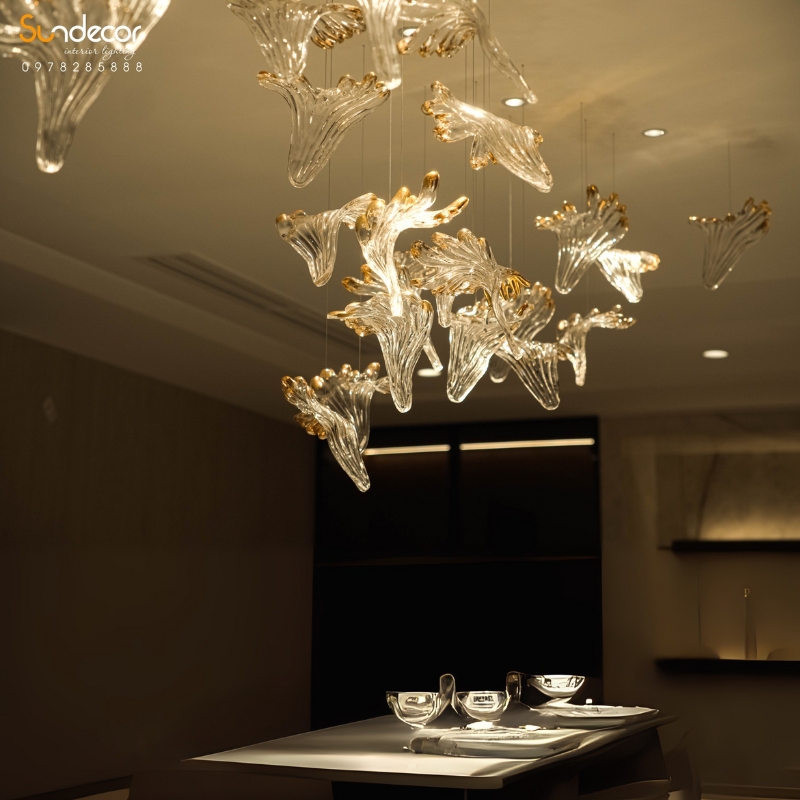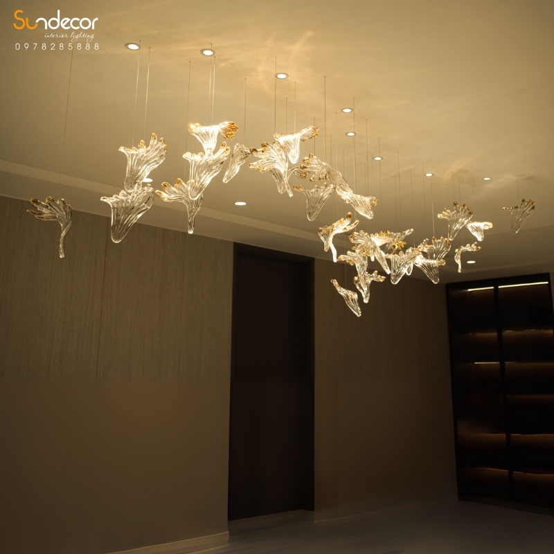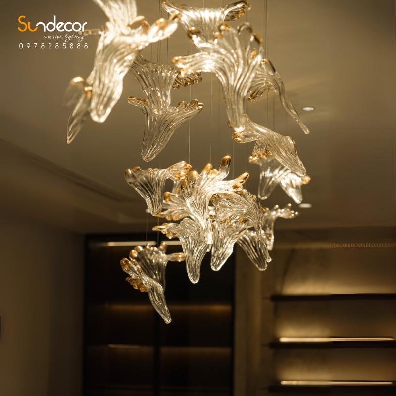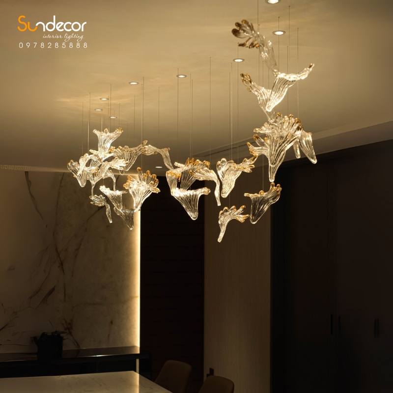 Thiết kế thả trần bất đối xứng mô phỏng chuyển động uyển chuyển của hoa trong gió, mang lại vẻ nhẹ nhàng và tự nhiên, đồng thời vẫn giữ được sự cân đối, hài hòa trong tổng thể. Sử dụng khung thép không gỉ mạ vàng kết hợp pha lê Best Class, mẫu đèn không chỉ là điểm nhấn trang trí mà còn là biểu tượng của đẳng cấp và gu thẩm mỹ tinh tế. Đây là lựa chọn lý tưởng cho bàn ăn biệt thự, không gian khách sạn cao cấp hoặc nhà hàng fine dining, nơi mỗi ánh sáng đều tôn vinh vẻ đẹp và sự sang trọng của không gian.