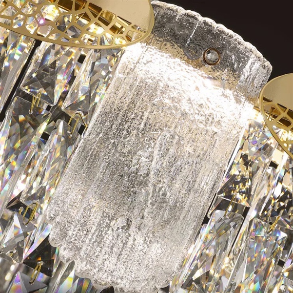 Thiết kế tạo điểm nhấn mạnh mẽ với viền đèn uốn cong mềm mại được mạ titan vàng tinh xảo, tạo nên sự xa hoa, lộng lẫy và độ bền màu vượt trội. Sự lộng lẫy được nhân lên bởi các chi tiết pha lê Best Class cao cấp, với độ trong suốt hoàn hảo và được bố trí dày đặc theo nhiều lớp. Sự kết hợp này tạo nên một hiệu ứng tán sắc ánh sáng rực rỡ, đạt được sự cân bằng hoàn hảo giữa vẻ đẹp lộng lẫy cổ điển và tinh thần tối giản đương đại.