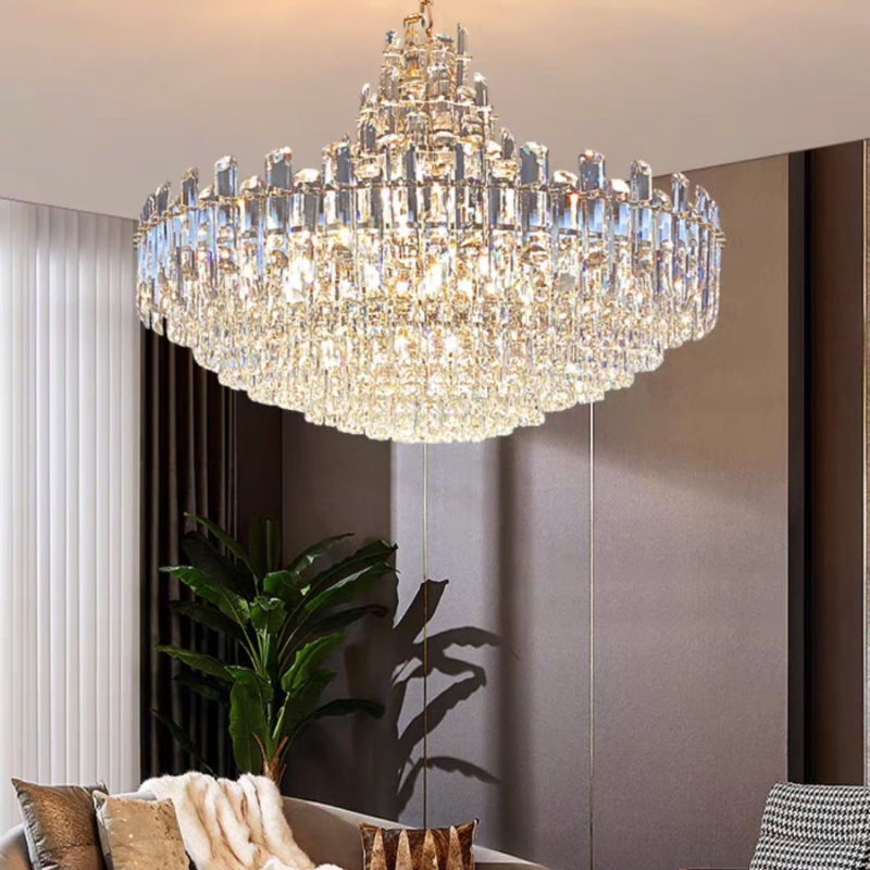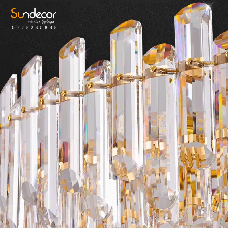 Một tuyệt tác ánh sáng lộng lẫy, mẫu đèn chùm pha lê này được chế tác từ hàng trăm thanh pha lê cao cấp xếp tầng tinh xảo, tạo nên hiệu ứng ánh sáng rực rỡ và đẳng cấp vượt trội. Thiết kế đối xứng hoàn hảo kết hợp ánh vàng sang trọng, lý tưởng cho không gian biệt thự, đại sảnh hay phòng khách xa hoa.