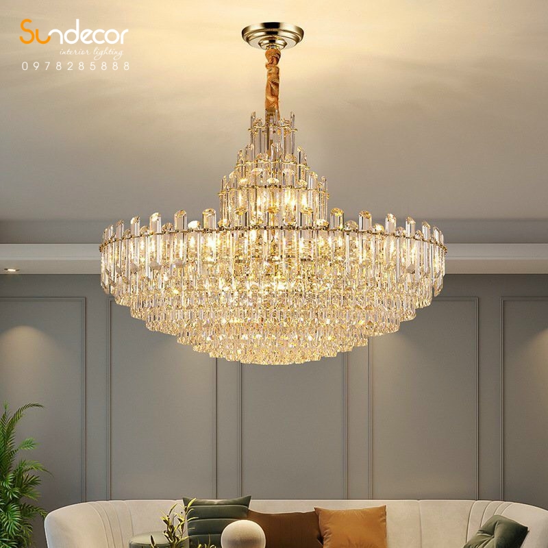 Tựa như một vương miện ánh sáng lơ lửng giữa không gian, mẫu đèn chùm pha lê này khiến mọi ánh nhìn bị thu hút bởi vẻ đẹp lấp lánh và uy nghi. Ánh sáng từ mỗi tầng pha lê lan tỏa ấm áp, tạo nên không khí vừa quyền quý, vừa gần gũi – như ánh hoàng kim đọng lại trong từng khoảnh khắc sống.
