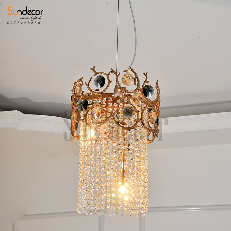 Được thiết kế tỉ mỉ, trau chuốt từng thanh kim loại được bẻ cong có hình thù như những cành cây khô màu vàng nhạt nhẹ nhàng cấu thành khung ngoài, bên trong là những hạt pha lê nhỏ gắn liền vào nhau rũ thướt tha xuống. Một vẻ đẹp lôi cuốn làm cho ngôi nhà của chúng ta sang trọng và cao cấp hơn bội phần.