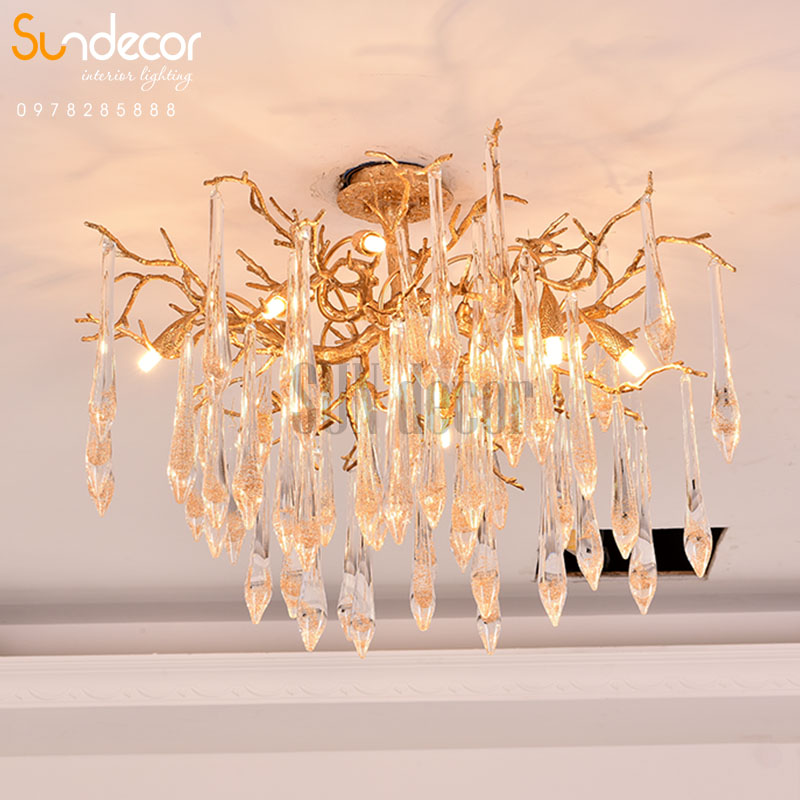 Nhìn từ dưới lên, mẫu đèn chùm Morani pha lê nhập khẩu – GP001DC-SR trông tựa như một thân cây khô với những “giọt sương” pha lê lấp lánh. Phần thân đèn được làm từ hợp kim xi mạ vàng với các đường nét uyển chuyển mềm mại, sống động và đầy tinh tế. Pha lê cao cấp trong suốt tạo cho những “giọt sương” một vẻ đẹp trăng trong và tinh khôi.