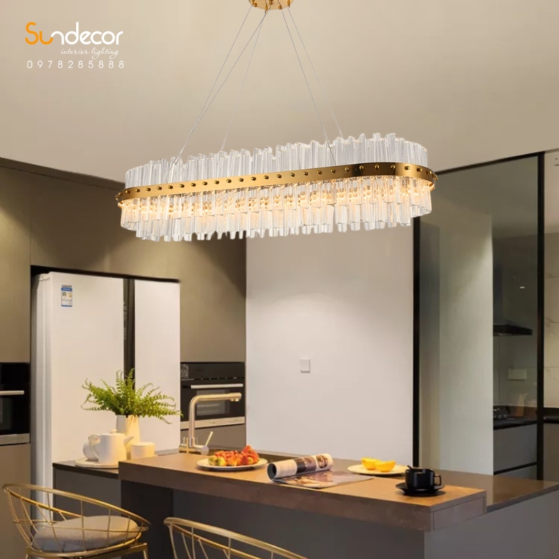 Đây là loại đèn có dây treo lên trụ bám trần nhà và nhẹ nhàng buông xuống là khung đèn hình elip. Bao quanh khung đèn là các thanh pha lê có độ dài vừa phải tạo nên sự gọn gàng. Lớp pha lê được thiết kế theo kiểu xếp kín trên dưới và trong ngoài. Thiết kế này khiến chiếc đèn khá gọn gàng nhưng lại không hề đơn điệu.