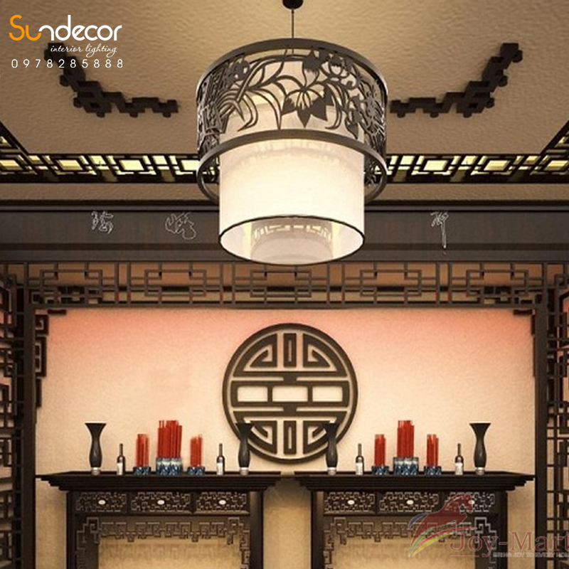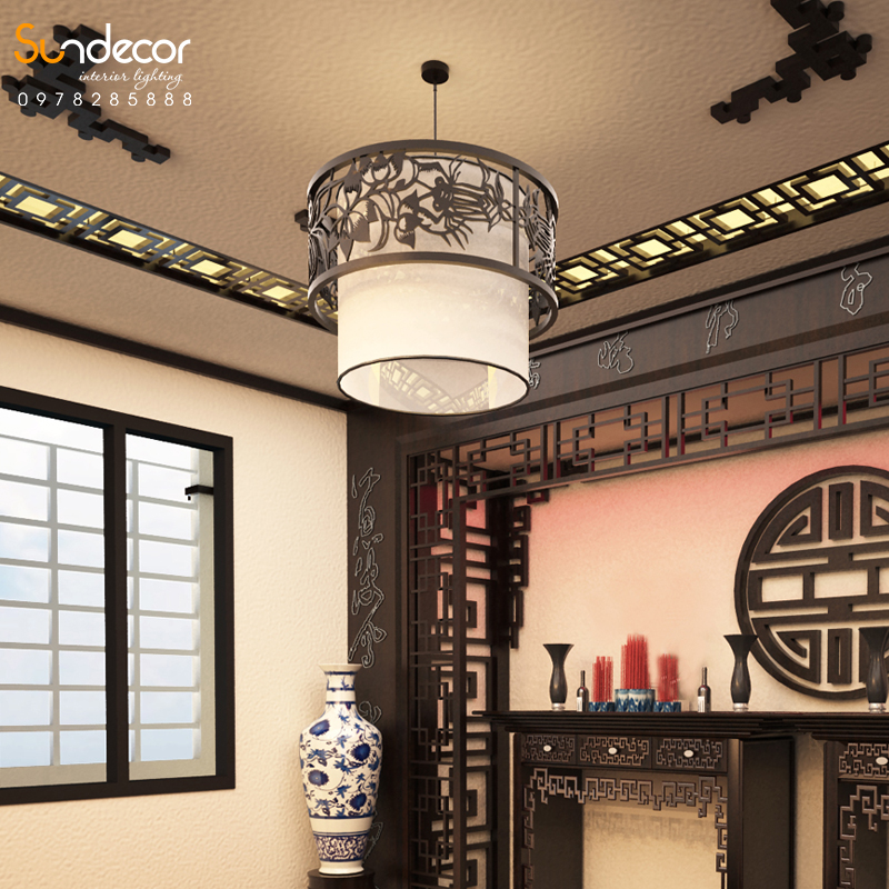 Tông màu nâu trầm hoặc đen giúp tôn lên đường nét tinh xảo và tạo chiều sâu thị giác. Phía trong, chao đèn được làm từ giấy da cao cấp, giúp ánh sáng khuếch tán mềm mại, dịu mắt, mang đến cảm giác ấm áp và linh thiêng. Đèn được treo từ trần bằng dây treo hoặc xích kim loại chắc chắn, có thể điều chỉnh độ dài tùy theo chiều cao không gian.