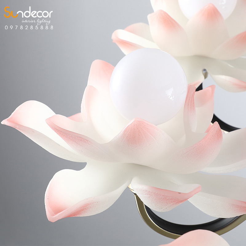 Khung đèn thường được chế tác từ đồng nguyên chất hoặc hợp kim đồng cao cấp – đảm bảo độ chắc chắn và độ bền vượt trội. Bề mặt đồng có thể được xử lý theo kỹ thuật cổ điển, tạo nên màu đồng giả cổ, tăng tính thẩm mỹ và độ bền màu theo thời gian. Phần chao đèn hình hoa sen được làm từ chất liệu Acrylic cao cấp – vừa chịu nhiệt tốt, vừa có khả năng khuếch tán ánh sáng mềm mại, góp phần làm nổi bật vẻ đẹp của từng “bông sen” khi đèn được bật sáng.