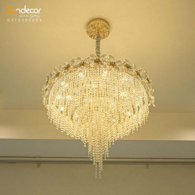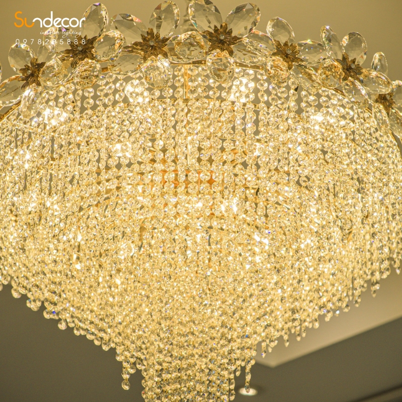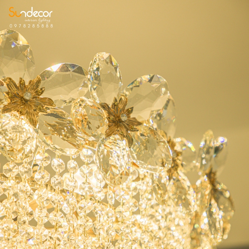 Mỗi chiếc đèn là sự kết tinh của hàng nghìn viên pha lê Best Class cao cấp, được cắt gọt tỉ mỉ và xếp lớp một cách tinh xảo. Ánh sáng khi khúc xạ qua từng viên pha lê lan tỏa thành những tia sáng đa chiều – lung linh nhưng vẫn mềm mại, tạo nên bầu không khí sang trọng, cuốn hút trong mọi không gian nội thất.