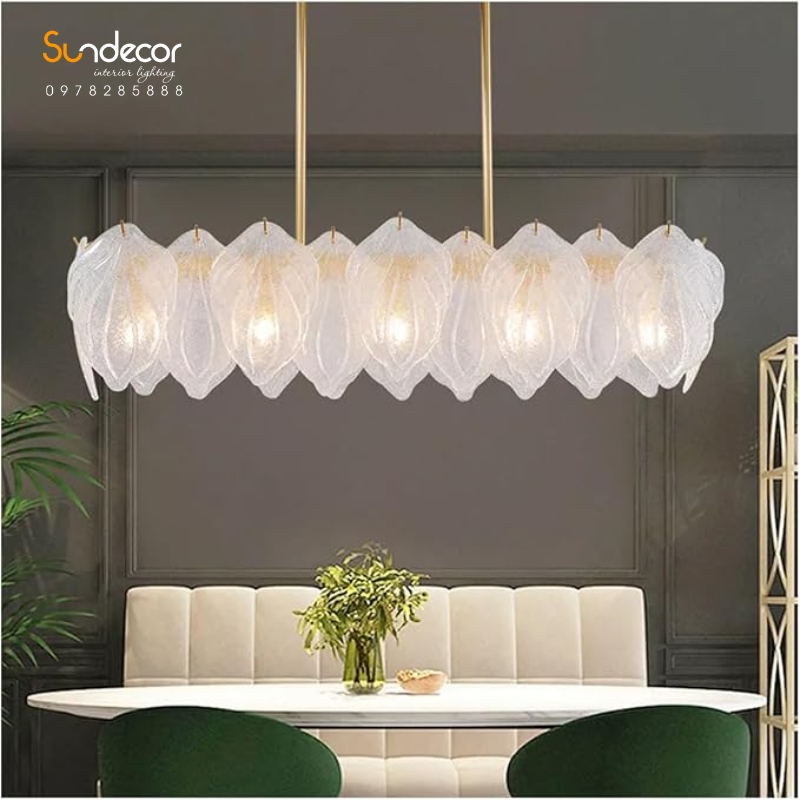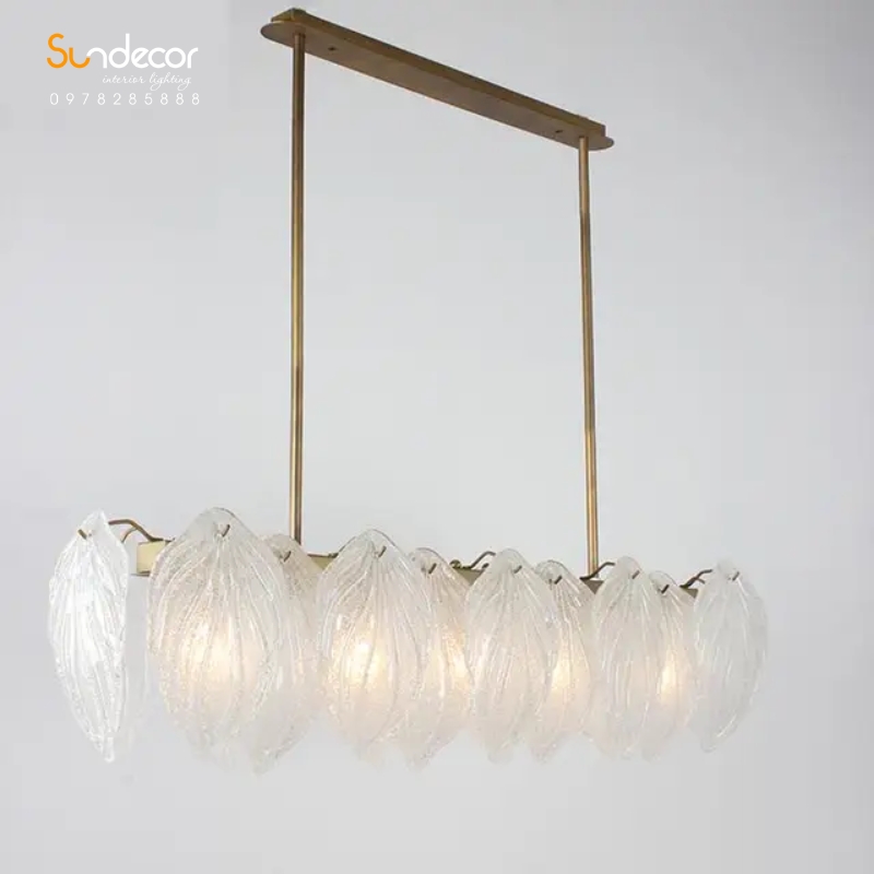 Tựa như những cánh lá đang khẽ đung đưa trong ánh sáng ban mai, mẫu đèn chùm pha lê này là sự hòa quyện đầy thi vị giữa nghệ thuật thủ công và phong cách thiết kế đương đại. Ánh sáng len qua từng vân pha lê, tạo nên bức tranh lung linh và sống động cho không gian.