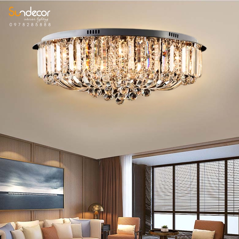 Điểm nhấn của mẫu đèn này là sự kết hợp từ những viên pha lê trong suốt cao cấp được chế tác một cách tỉ mỉ với những mặt cắt từ nhiều phía tạo ra hiệu ứng ánh sáng vô cùng bắt mắt.