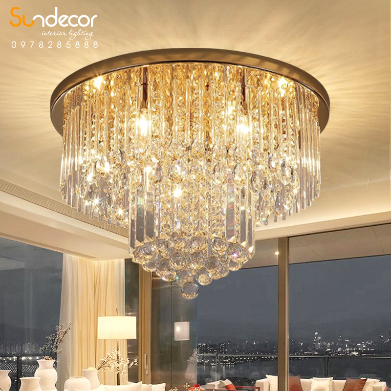 Khi ánh sáng LED xuyên qua từng hạt pha lê trong suốt, hiệu ứng khúc xạ ánh sáng tỏa rực rỡ như muôn vàn viên kim cương lấp lánh, khiến không gian trở nên ấm áp, sang trọng và đầy sức sống. Các vòng pha lê đồng tâm được sắp xếp theo nhiều lớp, tạo chiều sâu thị giác, đồng thời tăng khả năng phản chiếu, mang lại hiệu ứng lung linh khó cưỡng.