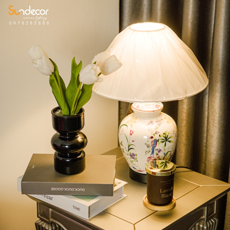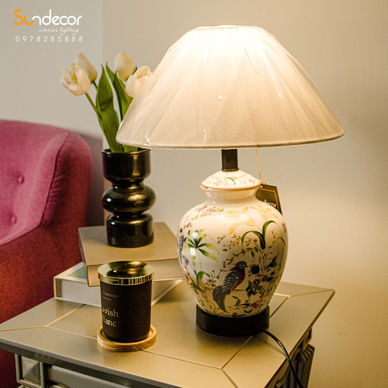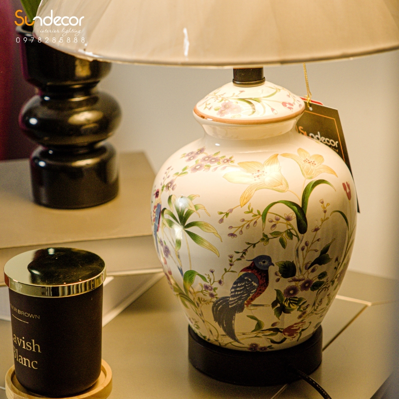 Chiếc đèn bàn gây ấn tượng với phần thân làm từ gốm sứ cao cấp, mang dáng dấp cổ điển, đầy đặn và vững chắc. Trên nền men sứ láng mịn là những họa tiết vẽ tay sống động – hoa lá, chim muông, cỏ cây – được thể hiện bằng đường nét mềm mại và sắc màu tươi tắn. Từng chi tiết đều phản ánh tay nghề điêu luyện của nghệ nhân, biến chiếc đèn thành một bức tranh thu nhỏ đầy chất thơ. Phần đế đèn màu trầm giúp làm nổi bật thân gốm, đồng thời tăng thêm vẻ vững chãi, trang nhã.