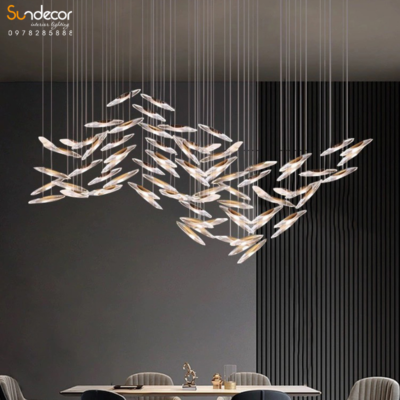 Được thiết kế là những sợi dây cước treo những viên pha lê, những sợi dây mảnh mai như vô hình treo những viên pha lê lấp lánh, khiến cho chiếc đèn trông như những chú đom đóm bay trong khu rừng đêm hè.