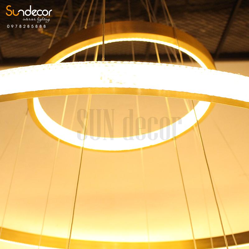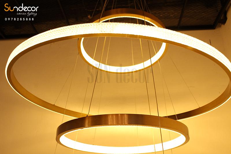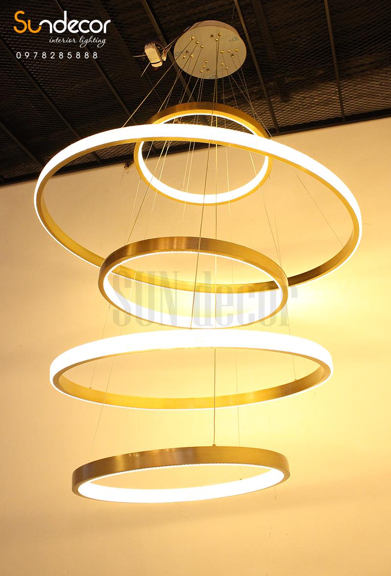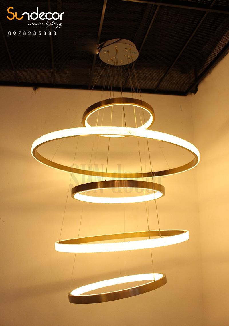Mẫu đèn có kích thước hoành tráng với độ dài đáng kể mang đến sự sang trọng và đẳng cấp cho không gian sống. Những vòng tròn vàng titan với kích thước lớn nhỏ khác nhau xen kẽ tạo nên sự độc đáo cho không gian sống.
