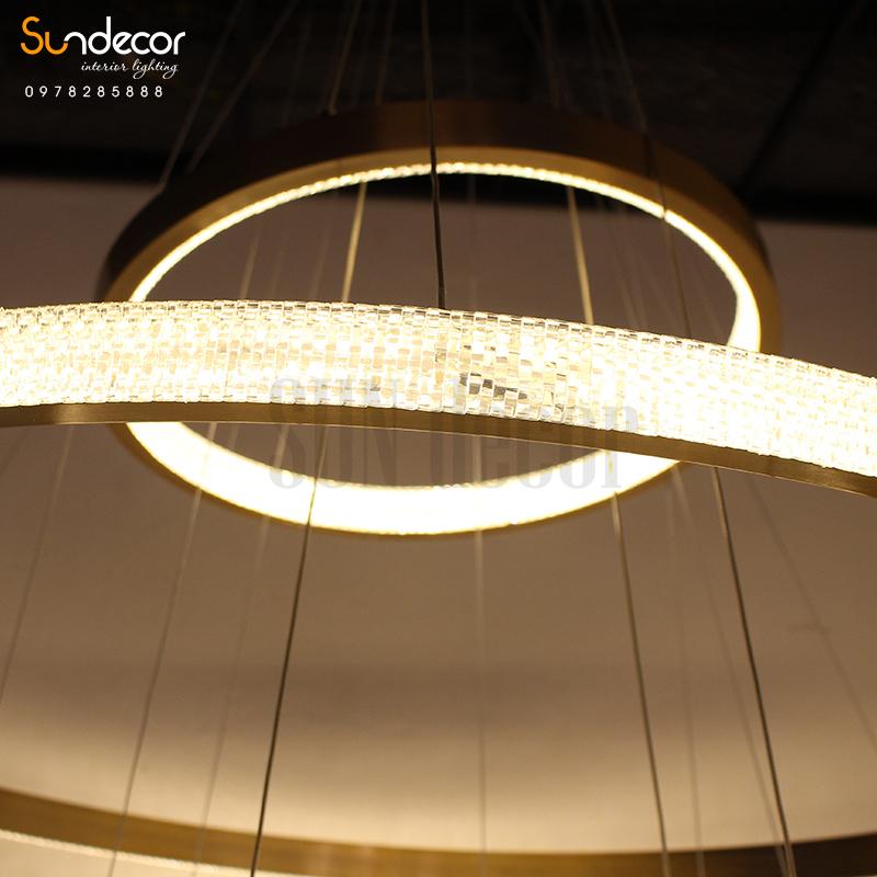 Số lượng vòng và kích thước vòng khách hàng có thể tùy chọn tùy vào độ rộng của không gian sống. Những viên pha lê được gắn thành vòng tròn xung quanh khung đèn giúp ánh sáng có thể phản quang một cách tối đa.