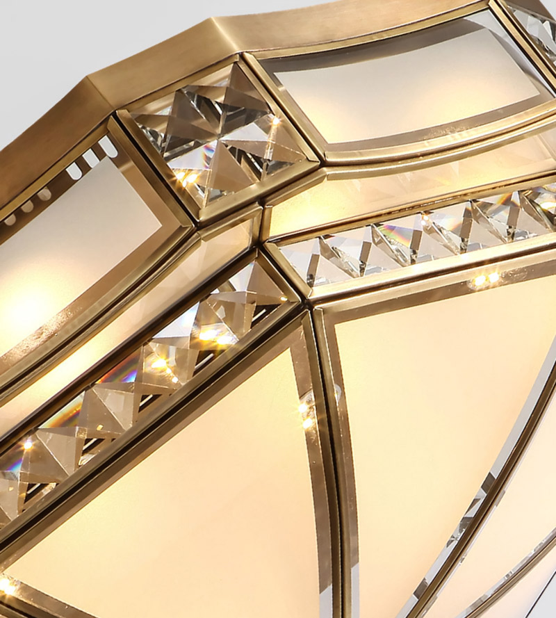 Khung đồng nguyên chất của đèn được chế tác tỉ mỉ, sáng bóng, vừa tăng thêm vẻ quyền quý vừa đảm bảo độ bền vượt trội, chống ăn mòn và oxy hóa theo thời gian. Điểm nhấn độc đáo của chính là sự kết hợp giữa thủy tinh mờ và pha lê cao cấp, mang đến ánh sáng dịu nhẹ, ấm áp, đồng thời tán sắc rực rỡ, biến mỗi chiếc đèn thành một tác phẩm nghệ thuật thực thụ.