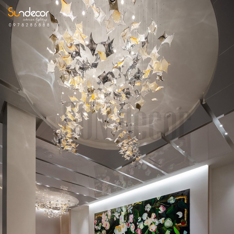 Cấu trúc nhiều tầng kết hợp cùng các chi tiết pha lê trong suốt giúp ánh sáng phản chiếu và khúc xạ đa chiều, tạo nên hiệu ứng thị giác lãng mạn, huyền ảo. Sự tinh xảo trong cách sắp xếp mang lại chiều sâu và sự linh hoạt, khiến không gian như rộng mở và tràn đầy cảm xúc.