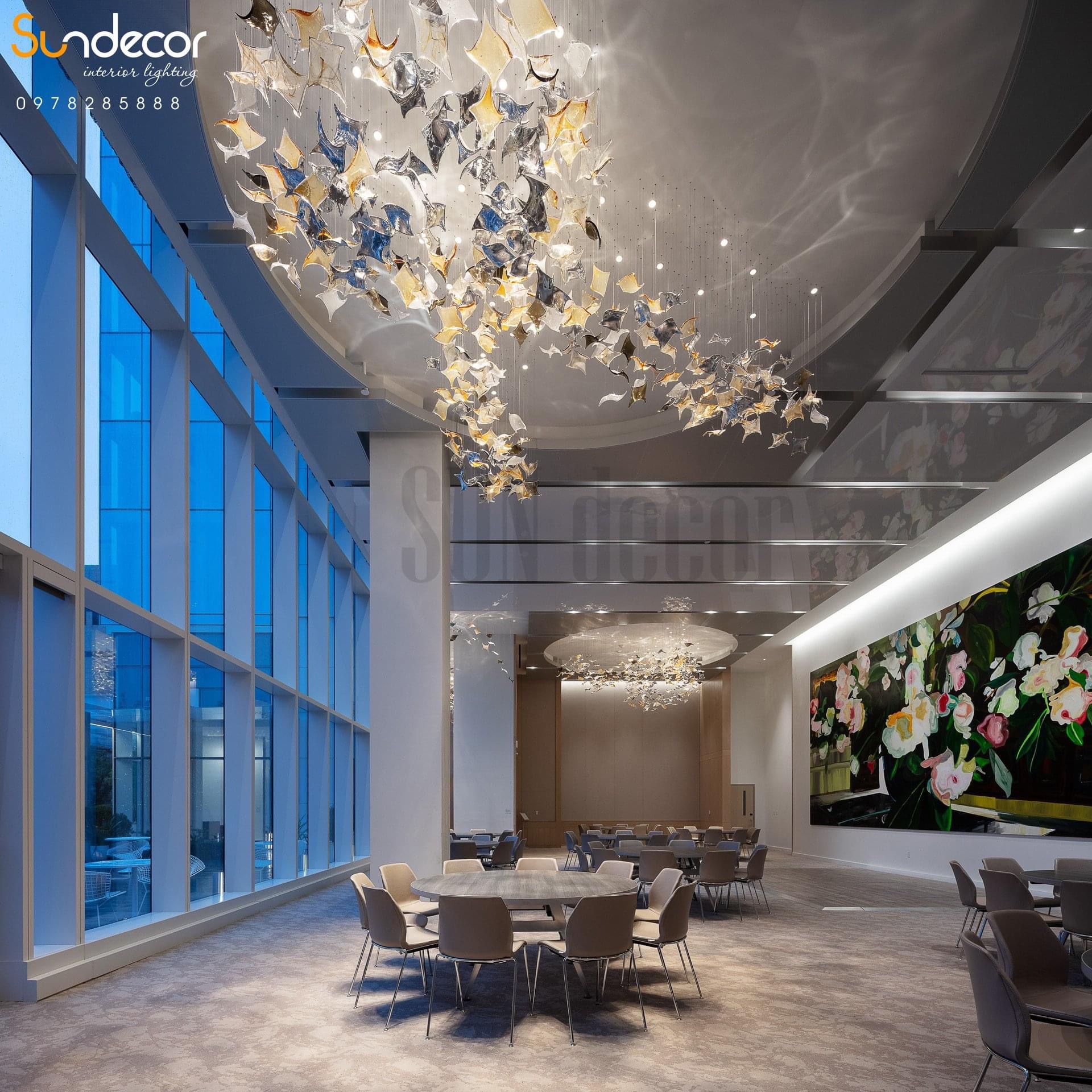 Tựa như một đám mây ánh sáng bồng bềnh giữa không trung, mẫu đèn mang lại cảm giác nhẹ nhàng, sống động và đầy cảm hứng cho không gian. Ánh sáng không chỉ lan tỏa, mà như đang “chuyển động”, thổi hồn thi vị vào từng góc nhìn và từng bước chân trải nghiệm.