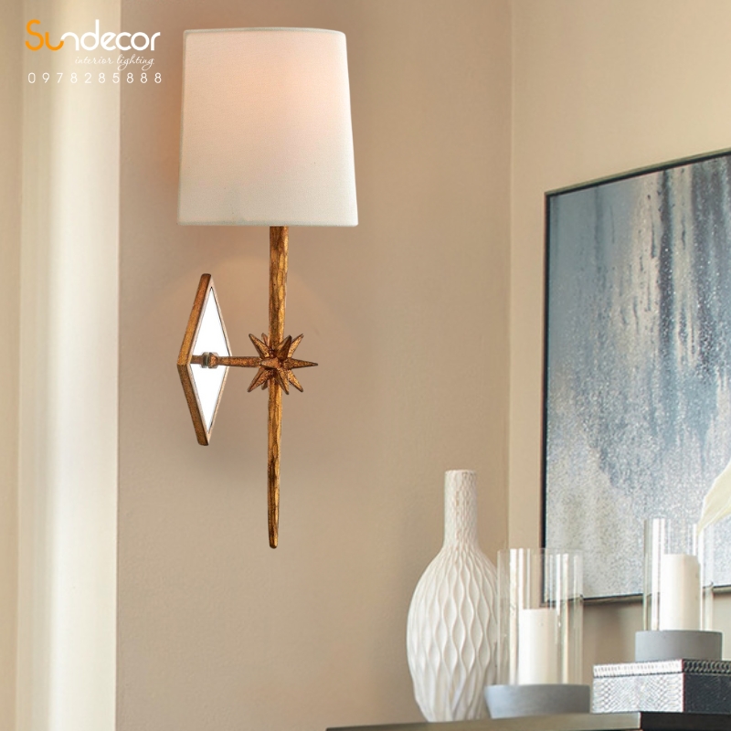 Mẫu đèn tường này nổi bật với thiết kế thanh mảnh, tinh tế nhưng đầy ấn tượng. Phần khung được chế tác từ đồng nguyên chất với bề mặt xử lý thủ công, tạo hiệu ứng ánh vàng sang trọng và cổ điển. Điểm nhấn đặc biệt nằm ở họa tiết ngôi sao tám cánh tinh xảo, gắn trên tấm đế hình thoi phủ gương phản chiếu, vừa tăng chiều sâu vừa tạo hiệu ứng ánh sáng lung linh.