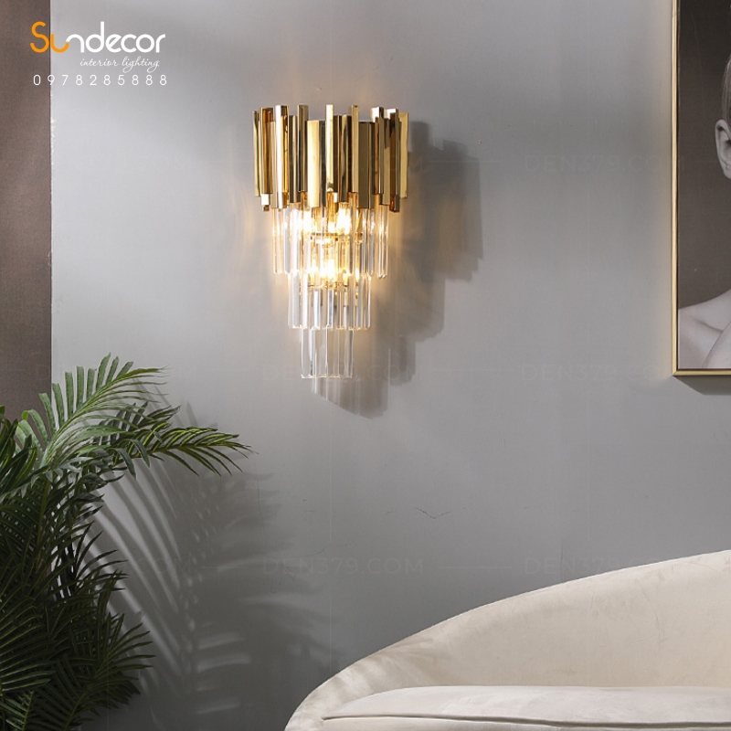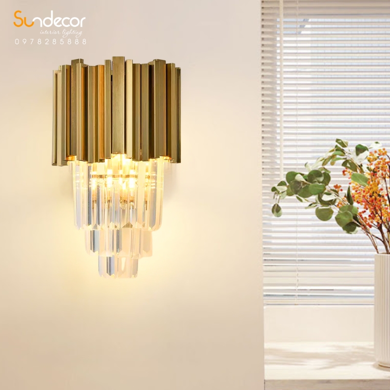 Mẫu đèn tường này sở hữu thiết kế sang trọng và cuốn hút, lấy cảm hứng từ những khối hình học xếp lớp tinh tế. Phần khung được chế tác từ inox cao cấp, xử lý bề mặt bằng công nghệ mạ vàng titan hiện đại, mang lại độ bóng sáng hoàn hảo, chống oxy hóa và giữ màu bền đẹp theo thời gian.