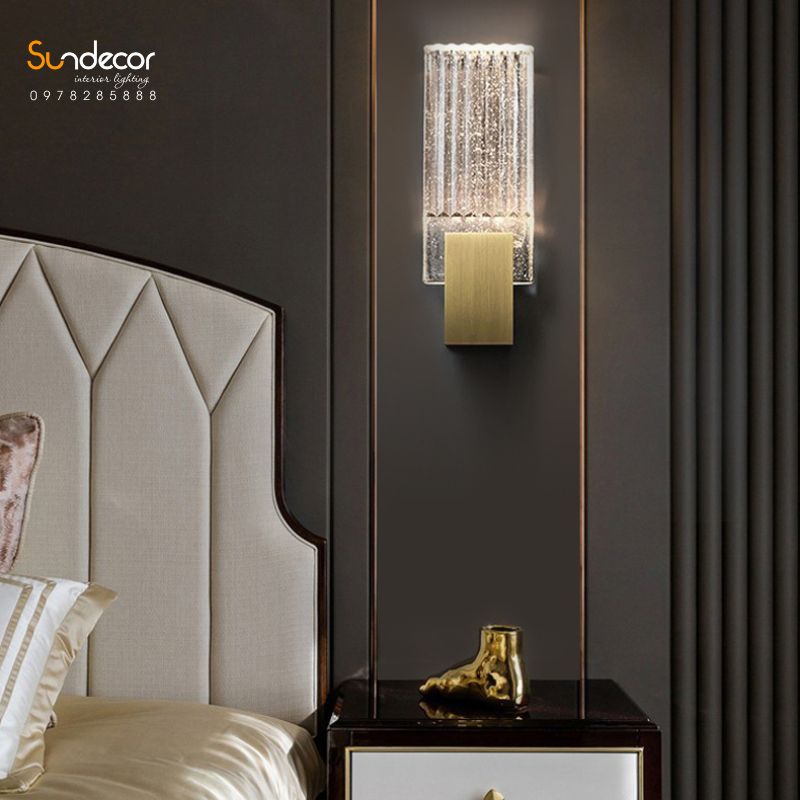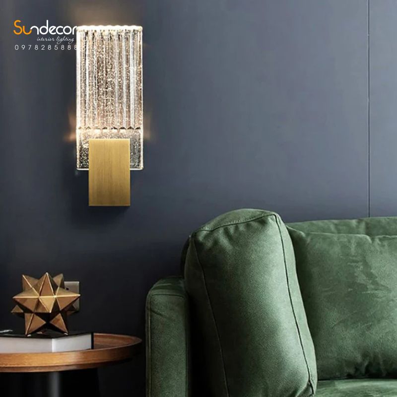 Mẫu đèn tường nổi bật với kiểu dáng hình trụ đứng, lấy cảm hứng từ kiến trúc hiện đại kết hợp nét tinh xảo của nghệ thuật chế tác pha lê. Chao đèn pha lê được gia công tỉ mỉ với các đường cắt dọc đều đặn, tạo hiệu ứng phản chiếu ánh sáng lung linh và sang trọng. Thiết kế tối giản nhưng giàu tính thẩm mỹ, vừa đủ để tạo điểm nhấn tinh tế mà không làm rối không gian.
