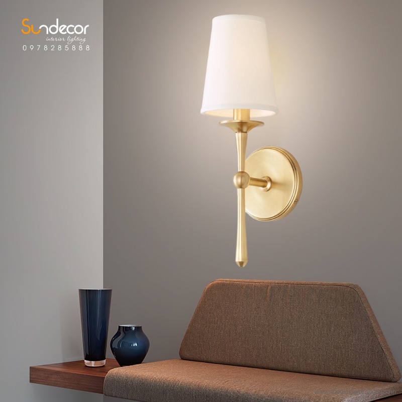 Đèn tường này sở hữu thiết kế mang phong cách tân cổ điển, vừa thanh lịch vừa hiện đại. Đèn có kiểu dáng gọn gàng với thân kim loại thon dài, tạo điểm nhấn bằng các đường nét uốn lượn mềm mại. Phần chụp đèn hình nón được làm từ vải cao cấp, giúp khuếch tán ánh sáng một cách nhẹ nhàng, tạo cảm giác ấm cúng và thư thái. Màu sắc chủ đạo của đèn là vàng ánh kim kết hợp với trắng kem, mang đến sự tinh tế và sang trọng. Đèn tường không chỉ là một vật dụng chiếu sáng mà còn là một tác phẩm nghệ thuật, giúp không gian trở nên đẳng cấp hơn.