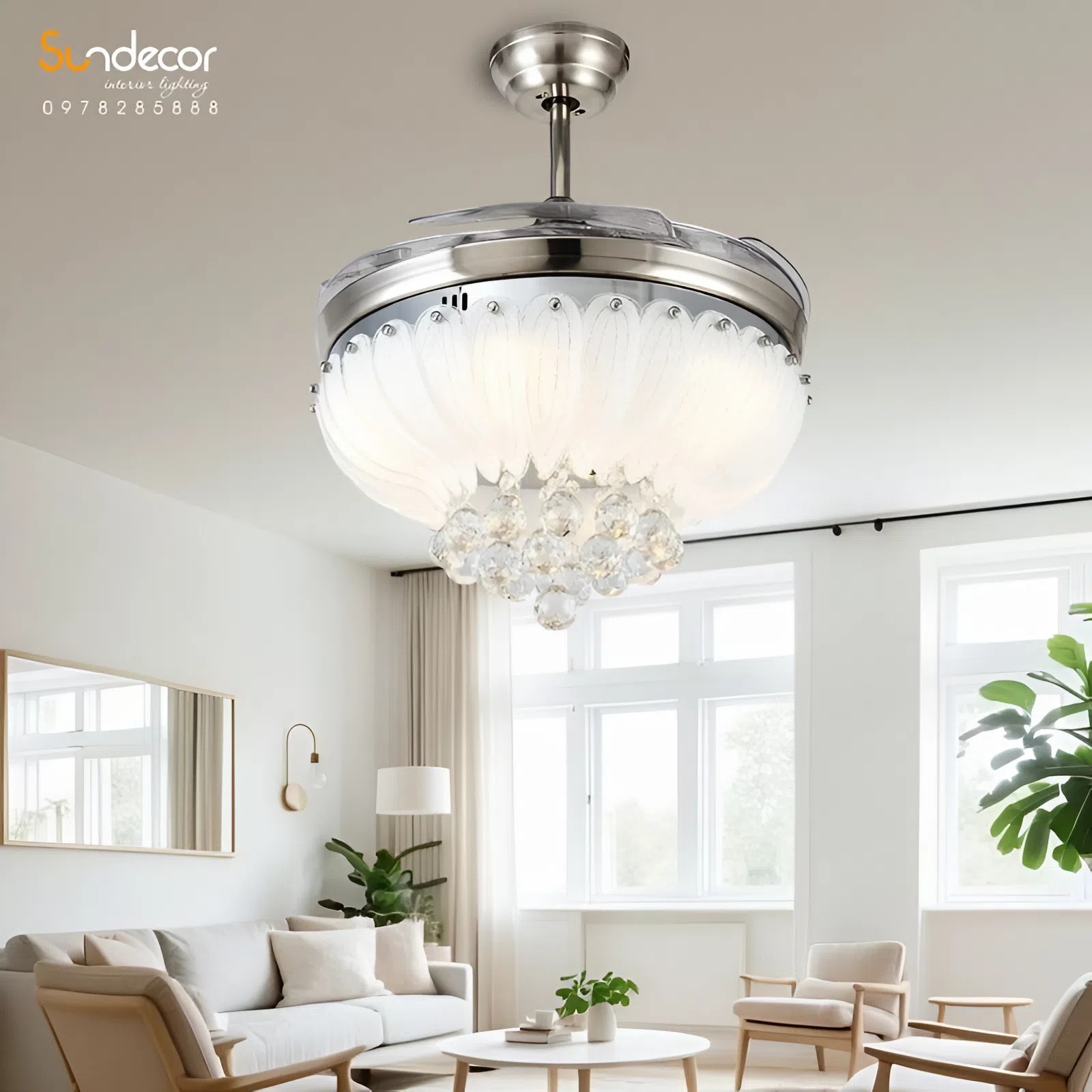 Toàn bộ pha lê K9 cao cấp kết hợp với cánh quạt acrylic trong suốt có thể thu vào và thân đèn kim loại chất lượng cao tạo nên một tổng thể hài hòa, vừa bền bỉ, vừa thẩm mỹ. Khi bật quạt, cánh acrylic tự động xòe ra, tạo luồng gió mạnh mẽ; khi tắt, cánh thu gọn, biến chiếc quạt thành đèn chùm sang trọng mà không chiếm nhiều không gian.