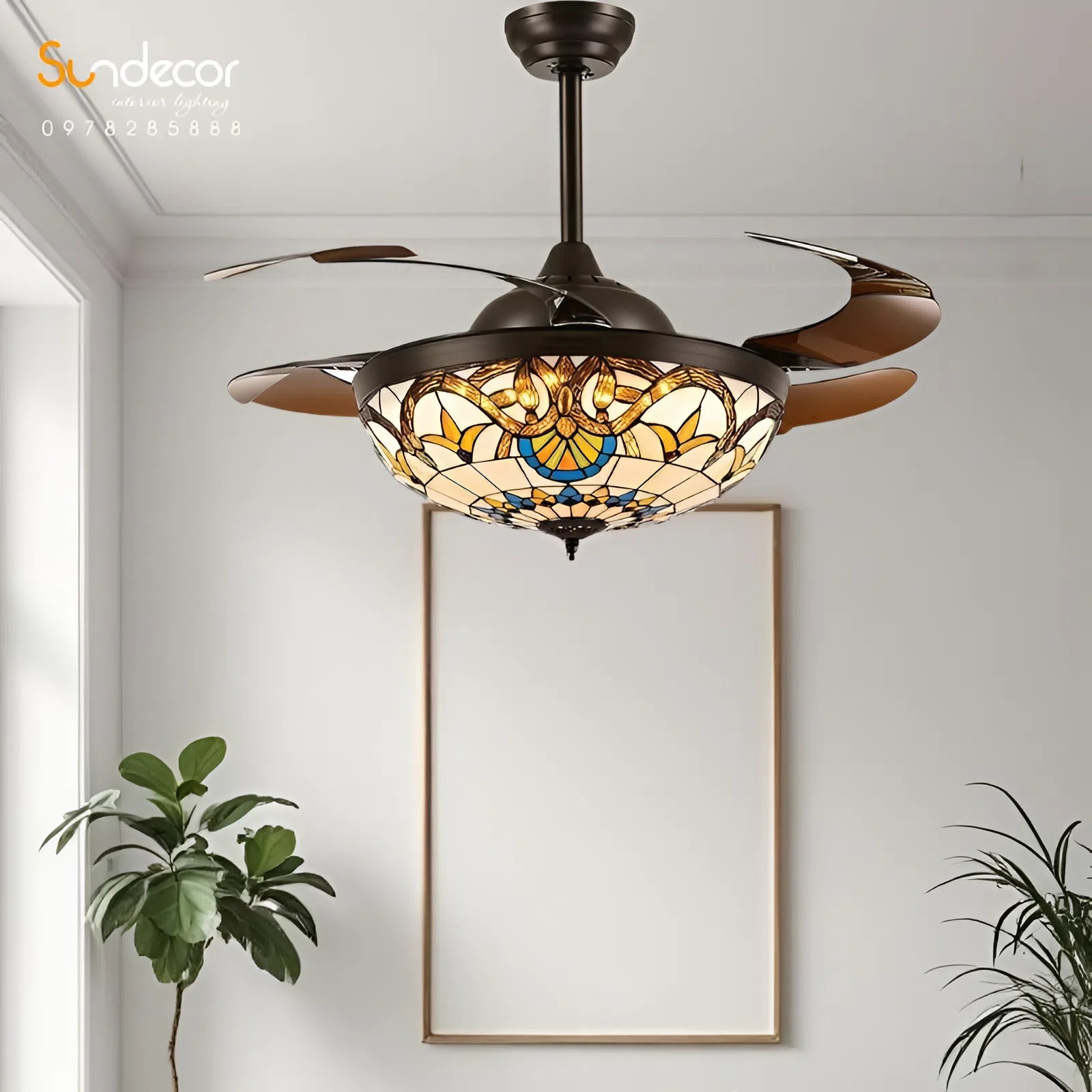 Nếu bạn muốn tạo điểm nhấn cho không gian thông qua một chiếc Quạt trần đèn chùm thì tuyệt đối không nên bỏ qua sản phẩm này. Đây là một sản phẩm có thiết kế khá độc đáo, phần thân đèn và chao đèn được làm từ hợp kim cao cấp. Phía dưới được trang trí cầu kì bởi những hoa văn bắt mắt mang màu sắc tươi trẻ. Chắc chắn, dù khi ánh đèn bật lên hay không bật thì nó vẫn luôn là một chi tiết vô cùng bắt mắt trong không gian.